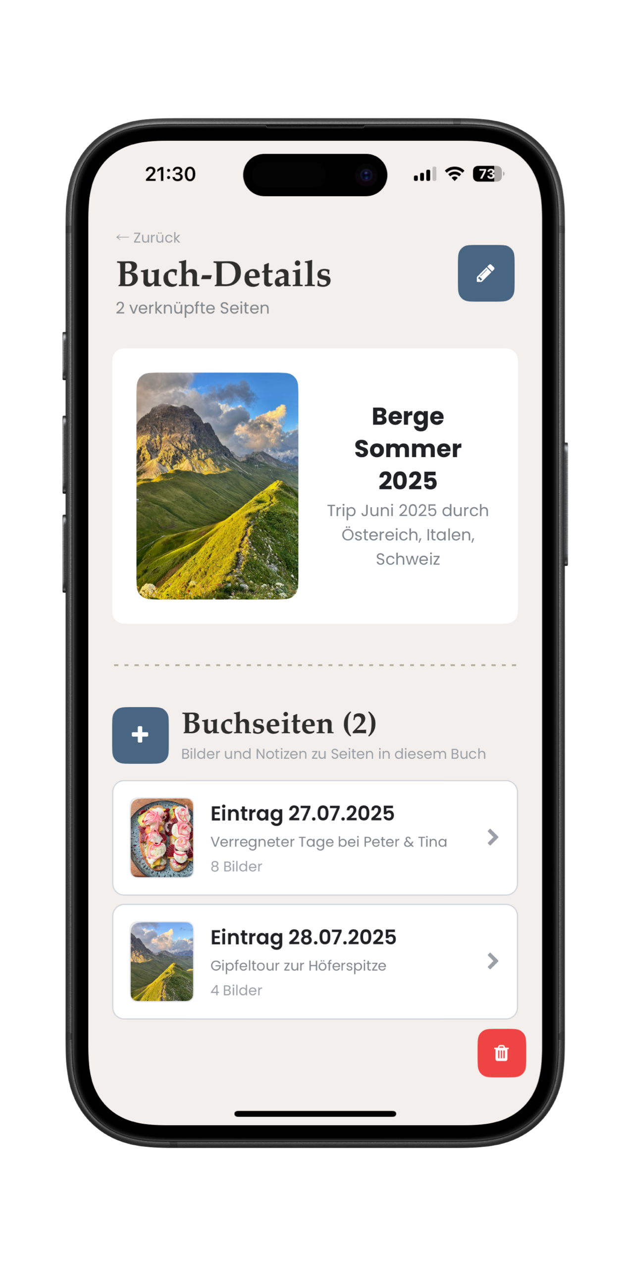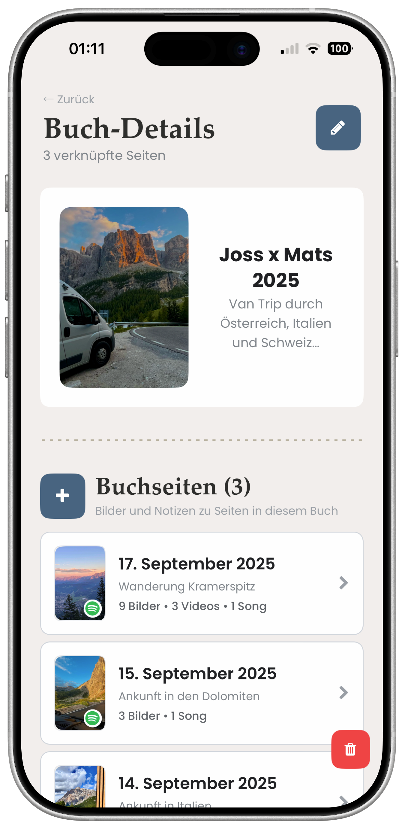 Create separate Books for each separate journal or travel diary you start - Summer Vacation 2026, Vanlife, or Backpacking South East Asia. Books keep your added memories organised, easy to browse, and separated according to your own journals.
